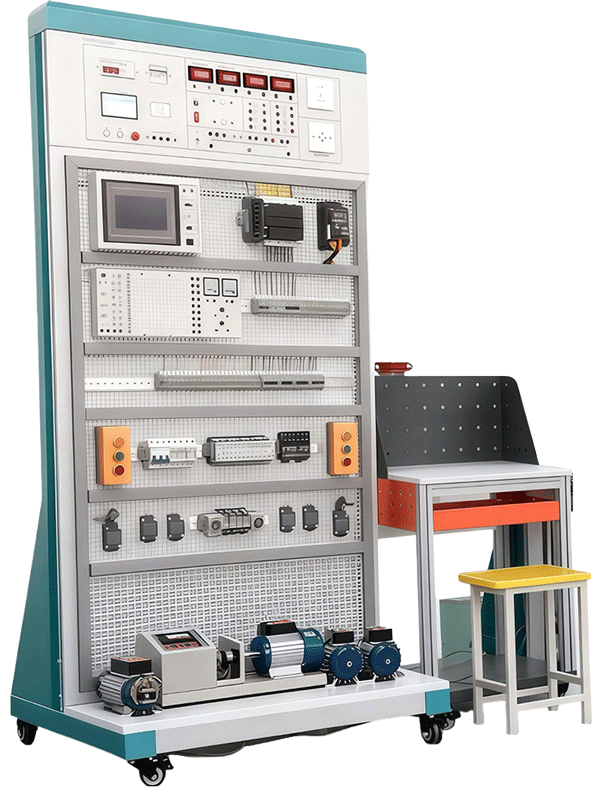 電氣及電機控制實訓考核裝置、機電一體化電氣控制綜合實訓臺包含集成多種電氣模塊(如儀表、PLC、觸摸屏、控制按鈕、接線端子等)的實訓掛板,電機及傳動機構,配套的實驗臺桌、座椅,以及用于安裝機械部件的多孔支架。