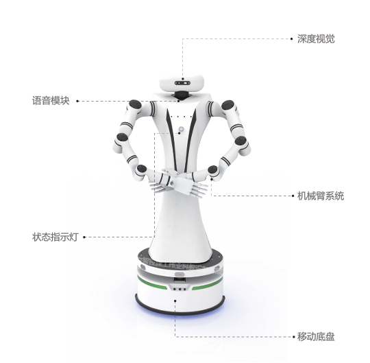 一.機(jī)器人整體組成:不少于1個(gè)主控模塊、不少于1個(gè)移動(dòng)底盤、不少于2條七軸機(jī)械臂、不少于1個(gè)末端執(zhí)行器、不少于1個(gè)深度視覺(jué)傳感器;